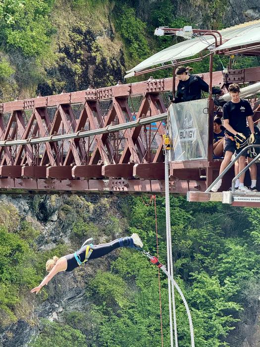 23 Kilometer östlich von Queenstown auf dem Highway 6 kommen wir an der Kawarau Bridge vorbei. Die Hängebrücke über den Kawarau Fluss ist sehr populär für Bungee-Sprünge und war der erste Ort weltweit, an dem organisiertes Bungee angeboten wurde. Der Fluss ist wunderschön hellblau, links und rechts 43 Meter hohe Felswände. Über diesen Fluss führt die bekannte Kawarau Bride. Daneben befindet sich eine Aussichtsplattform mit Cafe, von der aus man im Minutentakt Leute in die Tiefe springen sieht. Die ganze Anlage ist sehr modern, serviceorientiert und lädt auch nicht Springer zum verweilen ein.