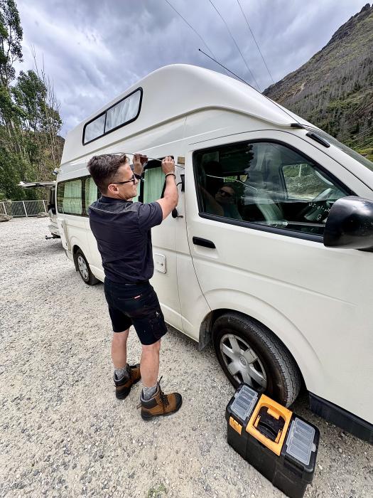 Wir sehen uns die mutigen Verrückten an, fotografieren ein paar Absprünge und machen uns wieder auf dem Weg. Entlang am Kawarau Fluss kommt für uns noch ein folgenschwerer Aussichtspunkt. Wir parken, gehen zur Aussichtsplattform, bestaunen den reißenden Fluss in der tiefen Schlucht und flüchten wiedermal vor den garstigen Sandflies. Dann passiert‘s, was uns viel Zeit und Geld kostete. Ich mache die Schiebetür vom Camper zu, wir beide stehen draußen, nur der Autoschlüssel liegt noch mittig auf der Küchenzeile. Dank des Logsystems verriegelt sofort das Auto automatisch alle Türen.