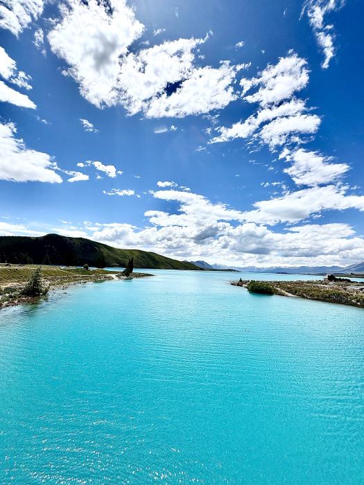 Der See besticht durch seine außergewöhnlich türkisblaue Farbe, welche vom Gletscherschmelzwasser gespeist wird und seine traumafte Lage zwischen schneebedeckten Bergketten. Der Ort Tekapo am See ist stark touristisch ausgerichtet mit Cafés, Souvenirgeschäften und teuren Unterkünften. Leider war der Campingplatz am See ausgebucht. Enttäuscht darüber, müssen wir nun unser Übernachtungsplanung verändern. Hier ist Hauptsaison, es sind so viele Camper, Vans oder Leute mit dem Zelt unterwegs, dass wir nun immer vorplanen müssen.