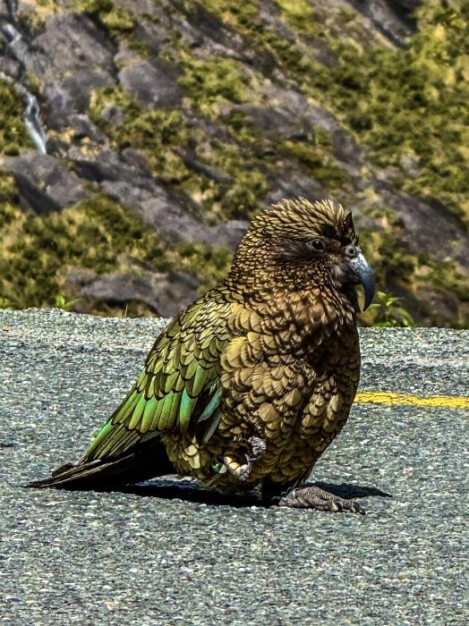 Daher sind wir „schnell“ (1,5h) herunter gewandert und haben den nächsten Fotostop angesteuert. Dort empfingen uns auf den Autodächern der abgestellten PKW der wahrscheinlich unbeliebteste Vogel Neuseelands. Der Kea ist eine höchst intelligente Papageienart, die in Neuseelands Hochgebirgen auf der Südinsel, beheimatet ist. Sie sind überaus elegante Flieger und haben ein wunderschönes glänzend-grünes Gefieder mit roten Federn an der Unterseite der Flügel und auf dem Rücken, ebenso einen kräftigen Schnabel und scharfe Krallen. Außerdem sind sie perfekt auf ihren eher kargen Lebensraum im Hochgebirge angepasst und haben eine unglaubliche Neugier und Zutraulichkeit entwickelt, die sie neben dem Hunger bei der Nahrungssuche unterstützt und sie alles, was potenziell essbar ist, aufs Genaueste untersuchen lässt. Das haben wir sofort erlebt, denn jeder Auto, was auf den Parkplatz führt, wurde von den Keas sofort inspiriert. Fenster- und Türgummis, Scheibenwischerblätter und auch Schläuche unter dem Auto, wurden mit den kräftigen Schnäbeln angeknabbert. Auch wir lachten und machten Fotos wie alle andern, aber als die frechen Kerle versuchten an unserem Camper irgendwelche Schläuche durchzubeißen, hörte der Spass auf. Zum Glück kam schon das nächste Auto auf den Parkplatz gefahren, so dass das Interesse an unserem nachließ. Beim bearbeiten eines Autodachfensters konnten wir noch ein paar schöne Bilder vor dem verlassen des Parkplatzes machen. Was für eine schöne Begegnung mit den neugierigen und schlauen Keas.