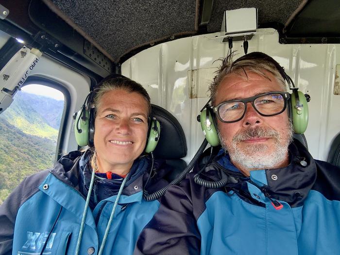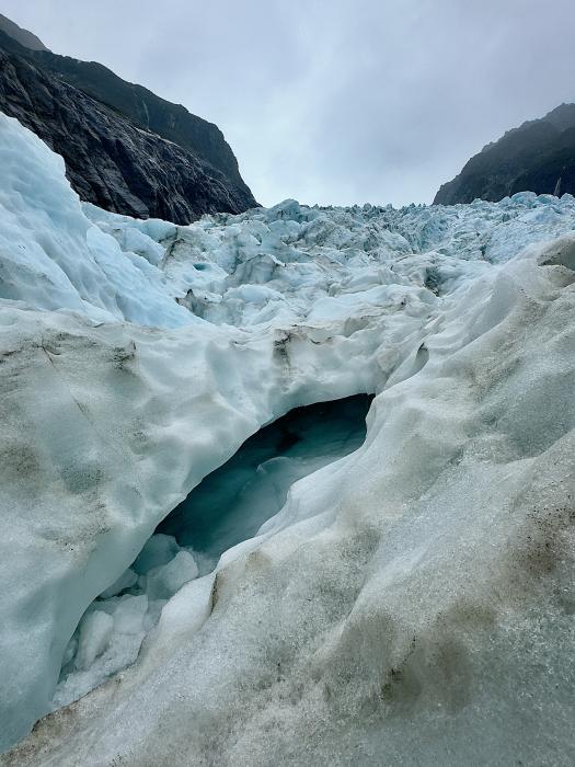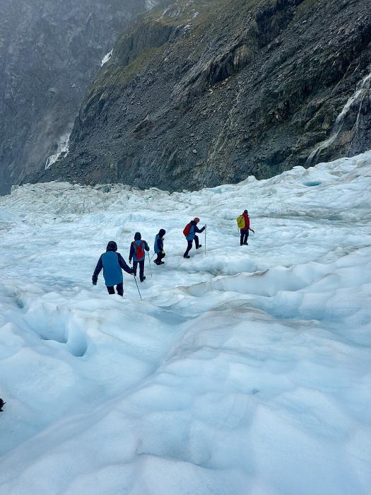 Unsere Gruppe, bestehend aus 13 Leuten, wurde mit Regenhose und Regenjacke, Wanderschuhen, dicken Socken, Handschuhen und einem Rucksack ausgestattet. Nach einer Sicherheitseinweisung wurden die Leute auf 3 Heli Flüge verteilt. Wir waren die erste Gruppe und sind mit einem Holländischen Paar, welches gerade auf Hochzeitsreise war, auf den Gletscher geflogen. Leider konnte keiner von uns vorne sitzen, da der Flug als Trainingsflug für eine zukünftige Pilotin genutzt wurde. Wir teilten uns also die Rückbank und dann ging es auch schon los. Beim Start wackelt der Heli ordentlich, aber sobald er in der Vorwärtsbewegung ist, hat man das Gefühl von Leichtigkeit. Wir fliegen durch den Canyon Richtung Gletscher und bestaunen von oben die schöne Landschaft. Wir erreichen nach ein paar Minuten die Gletscherzunge und landen kurz darauf auf der Höhe des Victoria Falls auf einem Plateau, direkt auf dem Gletscher. Als unsere Gruppe vollständig oben war, wurden wir mit Steigeisen und Wanderstock ausgestattet. Zwei Gruppen wurden entgegengesetzt durch die Eislandschaft mit einem erfahrenden Guide geführt. Der Fox Gletscher bewegt sich fast 10-mal schneller als die meisten anderen Talgletscher. Verschiebungen des Felsbodens erzeugen Erhebungen und tiefe Spalten - eine dramatische, aber auch gefährliche Eislandschaft bildet sich immer wieder neu. An den Gletscheroberflächen schmilzt ständig Eis, das sich zu kalten Flüssen vereint. Trotz Dauerregen hatten wir eine 3 stündige Wanderung durch diese bizarre Landschaft. Wir waren durchnässt aber happy über das Erlebte.