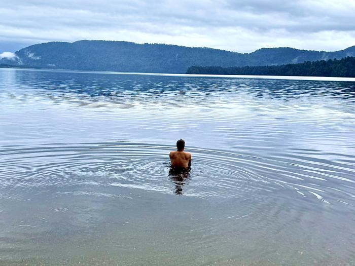 Wir finden ca. 20 km vor Rotorua einen Fluss, welcher öffentlich ist, nichts kostet und aus einer heißen Quelle gespeist wird. Einheimische und Touristen nehmen hier gemeinsam ein Bad und schmieren sich das Gesicht mit dem grauen Schlamm ein.