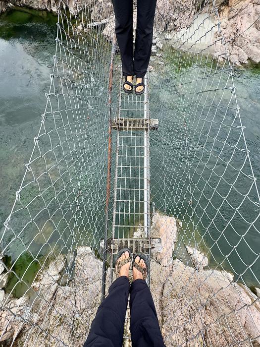 Wir besichtigen den Buller Gorge Adventure Park, zu dem man nicht mehr hinüberschwimmen muss, sondern über eine 110 Meter lange Hängebrücke balancieren kann - die längste Hängebrücke Neuseelands. 19 Meter über dem schnell dahinfließenden Buller River zu balancieren, ist allerdings eine ziemlich wacklige Angelegenheit! Wir laufen den relativ kurzen Loop Walk. Dieser führt uns an historischen Überresten des Goldrauschs vorbei.