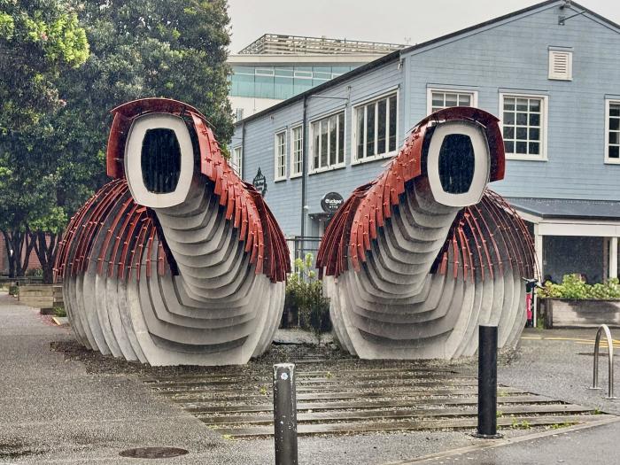 Die Innenstadt Napiers gleicht daher einer Filmkulisse. Wir hätten nicht erwartet, dass die Gebäude derart gut erhalten sind. Von den Straßenlaternen bis zu den Schriftzügen an den Gebäuden: Art déco ist in Napier omnipräsent. Diese Stadt ist groß aber übersichtlich und die Menschenmenge verläuft sich. Die Promenade führt direkt am Meer entlang, überall findet man Kunst und kleine Parkanlagen, Bäume, Palmen, bunte Blumen zieren den Mittelstreifen und die Straßenränder. Die Innenstadt ist bunt mit Weihnachtsdeko geschmückt.