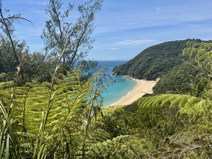 Die kurvenreiche Straße führt uns über die Takaka-Hügel bis wir schließlich die letzten 12 km auf einer fast einspurigen, unbefestigten Serpentínenstraße den Campingplatz erreichten. Wir benötigten für das staubige Streckenende geschlagende 45 min. Nach dem kurvenreichen Tag haben wir den Rest des Tage am Strand bei schönsten Sonnenschein verbracht. Der DOC Stellplatz ist einer der beliebtesten Campingplätze in Nz und bietet bis zu 850 Leuten (in der Weihnachtszeit ist dieser komplett ausgebucht) stromlose Übernachtungsstellplätze. Der lange Stand hat eine goldgelbe Färbung und das türkisfarbene Wasser lädt zum Baden ein. Dort haben wir Rita und Holger wiedergetroffen, welche wir auf dem Fox Gletscher kennengelernt haben. Beide kommen aus Deutschland leben aber seit 35 Jahren in Kanada, da Holger dort eine Chemieprofessur inne hat. Es ist schön, nach einer langen Zeit auch mal wieder mit anderen deutschen tiefgründigere Gespräche zu führen. Wir haben uns für den nächsten Tag für eine gemeinsame Wanderung verabredet. Aus Zeitgründen konnten wir nur ein kleines Stück mit den beiden wandern, da wir wieder zurück nach Kaiteriteri mussten. Die Wanderung führte uns an einsame Strände, zu schönen Ausblicken und durch üppige Vegetation. Mit einem erfrischenden Bad verabschieden wir uns von dem wirklich schönen Stellplatz und machen uns wieder auf eine kurvige Rückfahrt.