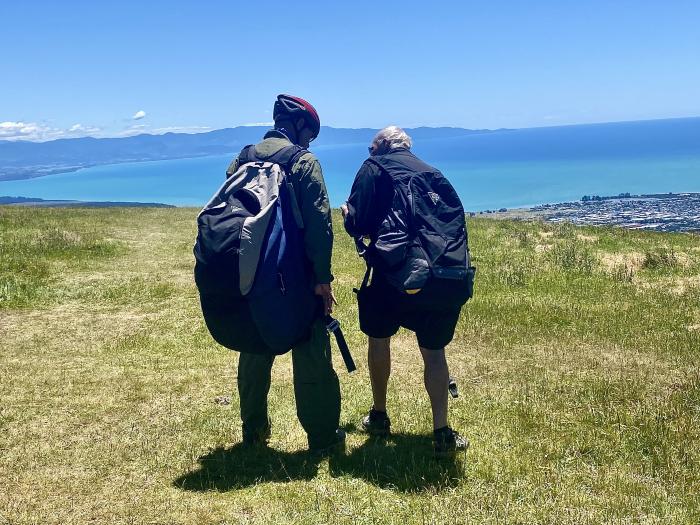 Früh am kommenden Morgen setzen wir unsere Fahrt Richtung Picton fort. Wir haben unsere ursprüngliche Überfahrt (23.12.) von der Südinsel auf die Nordinsel auf den 19.12. vorgezogen. Wir machen einen Zwischenstopp in Nelson und frühstücken in einem netten Café. Da die Region Nelson sich fantastisch zum Paragliding eignet und dies auf meiner Bucket List steht, ist schnell der Kontakt zu einem einheimischen Routinier hergestellt. Nelson Paragliding wurde 1993 gegründet und ist eine der am längsten laufenden Gleitschirmschulen Neuseelands. Somit verabredeten wir uns mit dem neuseeländischen Haudegen (leider haben wir seinen Namen vergessen) gegen 13 Uhr an einem Park. Auf dem Parkplatz hat er uns die Eckdaten zum Tandemflug gesagt und mit einem Handschlag war die Aktion gebucht. Wir wechselten vom Camper in seinen 4x4 Jeep und fuhren auf einen der vielen Berge in der Nähe von Stoke. Allein die steile Hochfahrt war ein Abenteuer. Der Haudegen, mit seinen in Indien gemachten perlweißen Zähnen, erzählte uns Flugstorys aus den Himalaya und von Europa. Wir merken seine Begeisterung fürs Fliegen aber auch fürs Campen, Tauchen und Fischen - was für ein neuseeländischer Naturbursche mit geschätzten 65+ Jahren. Am Start- und Landeplatz angekommen zeigte sich uns eine tolle Aussicht auf Nelson. Vorgelagerte Inseln, die Berge vom Abel Tasman NP und das azurblaue Meer. Der Haudegen prüft den Wind und dann muss es schnell gehen. Schirm auspacken, Equipment anlegen, Einweisungen und Sicherheitscheck.
