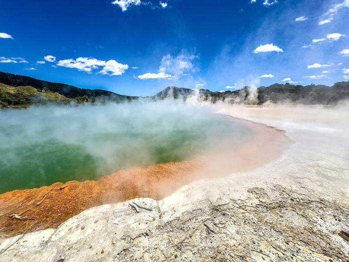 Dort haben wir viele bunte Quellen, Sinterterrassen, dampfenden Tälern, dem berühmten Champagnerpool mit seinem orangenfarbenen Becken sowie dem giftgrün leuchtenden Devil's Cave Pool gesehen. Eine faszinierende Landschaft mit tollen und unwirklichen Färbungen, welche durch die Sonne und den wolkenlosen Himmel besonders strahlten.