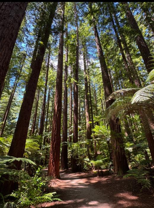 Anschließend wollten wir uns noch den Whakarewarewa Forest in Rotorua ansehen. Die Einheimischen sagen schlicht „The Redwoods“ zum Wald. Die von einheimischem Bush und den namensgebenden kalifornischen Baumriesen geprägten Redwoods bilden das Epizentrum der Mountainbikeszene und liegt praktischerweise nur wenige Minuten außerhalb des Stadtzentrums. Dieser Wald ist ein Mekka für Mountainbike-Fahrer aus Neuseeland und der ganzen Welt. Kein Wunder, dass die International Mountain Biking Association (IMBA) Rotorua den Goldstatus für seine Mountainbike-Infrastruktur verlieh - damit gehört die Stadt zu einem von nur sechs derartig ausgezeichneten Mountainbike-Zentren der Welt. Wir bestaunen bei einer Wanderung die Redwoods. Diese sind wegen der ungewöhnlich großen und bis zu 1500 Jahre alt werdenden Bäume mit Stämmen von bis zu 6 m Durchmesser, 110 m Höhe und einem Holzvolumen von bis zu 1100 Kubikmetern ziemlich spektakulär. Wir fühlen uns sehr kein aber auch sehr wohl in dem Wald.