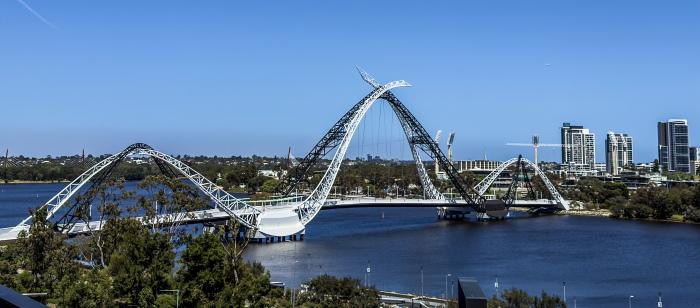 * Matagarup Bridge: Die 370 Meter lange Brücke ist viel mehr als nur eine Fußgängerbrücke. Sie verbindet das Optus Stadium und die Burswood Peninsula mit East Perth und symbolisiert ein „Zusammentreffen unterschiedlicher Kulturen“. Die fließenden Bögen können ein Paar schwarz- weiße Schwäne oder eine Wasserschlange, die für die lokale Noongar-Kultur von großer Bedeutung ist darstellen. Eine besondere Beleuchtung der Bögen erhellt die Brücke jede Nacht. Die Brücke hat sich schnell zu einem Wahrzeichen von Perth entwickelt.