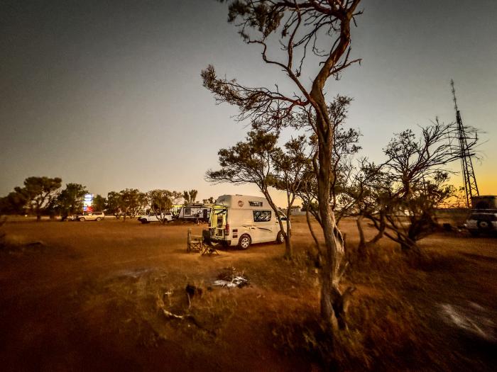 Ein paar Kilometerchen wollten wir noch zurücklegen, so dass der Weg bis zur Shark Bay am kommenden Tag nicht mehr ganz so weit ist. Ab 18:30 Uhr sollte man nicht mehr auf dem Hyw. fahren, da die Gefahr von Begegnungen der unangenehmen Art mit Kängurus sehr hoch ist. Ausschließlich die sehr langen Trucks (bis 45m lang) sind dann noch unterwegs. Die „kicken „ die Kängurus von der Strasse und merken es gar nicht. Kurz vor dem Sonnenuntergang haben wir irgendwo im Outback am Hwy. 1 bei einer Trucker Raststätten Stop gemacht. Hier gab es für uns einen kostenlosen Stellplatz, eine Tankstelle, saubere Sanitäre Einrichtungen - und Typen, die sonst nur auf DEMAX zu sehen sind.