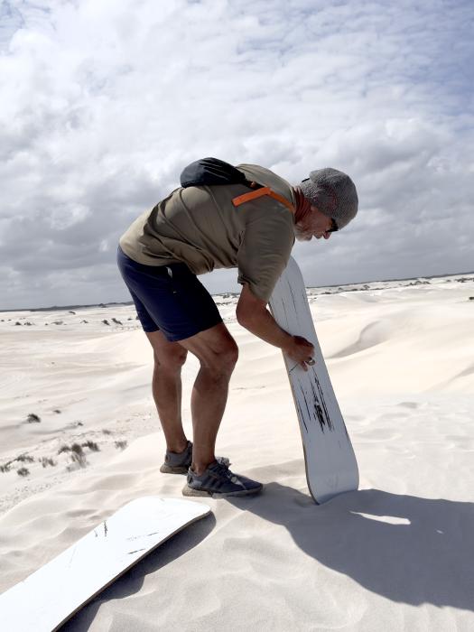 Durch regelmäßiges Wachsen plus der richtigen Technik - kann jeder Langläufer bestätigen :-) - erhöhen wir unsere Abfahrtsgeschwindigkeit und werden immer waghalsiger. Nach einer Stunde hoch und runter auf die Düne merkt man schnell, was man getan hat. Der feine Sand versteckt sich nach Verlassen der Dünen an jeder Körperstelle, so dass wir noch lange an den Spass erinnert werden.