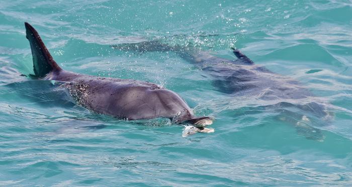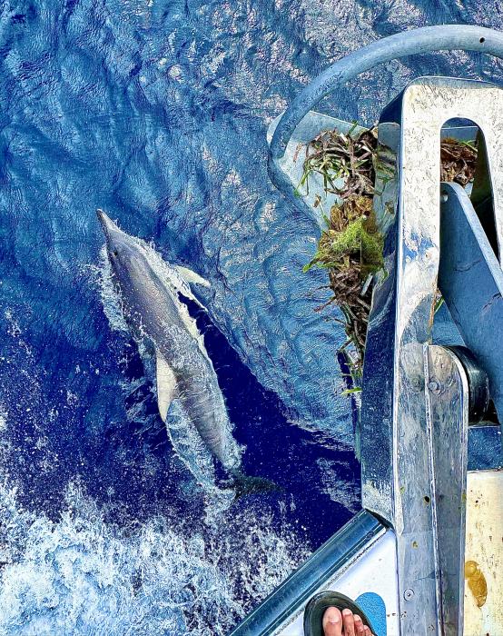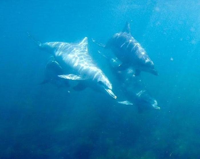 Ziemlich pünktlich gegen 8 kommen drei Delfine der Familie ziemlich nahe an den Strand., sie kommen sogar so nah, dass wir Ihnen in die Augen schauen können. Wir sind ziemlich berührt und freuen uns.