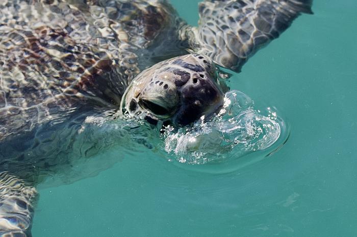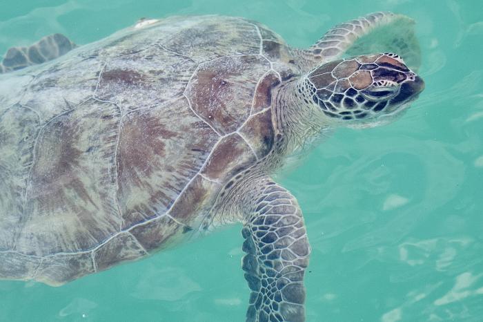 Angekommen sehen wir schon, wie sich am Steg Schildkröten tummeln, im Meer sehen wir Delfine springen und Pelikane warten am Strand. Schon mal ein hübsches Bild.