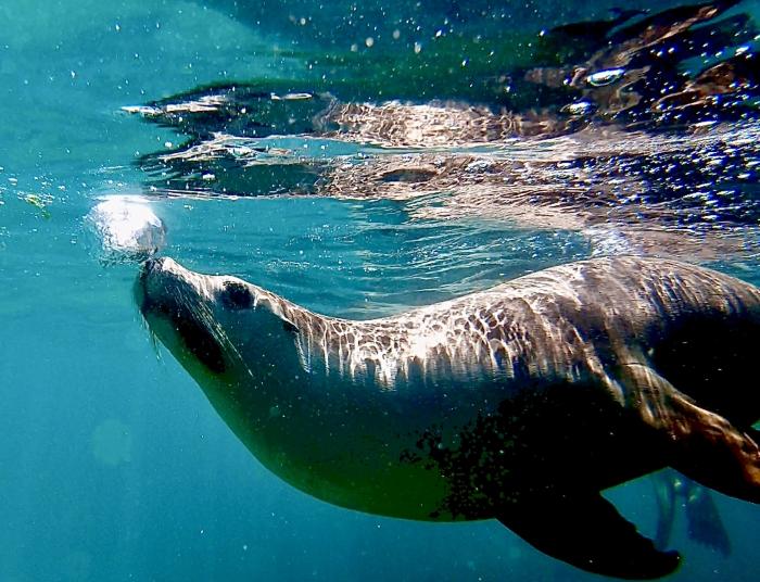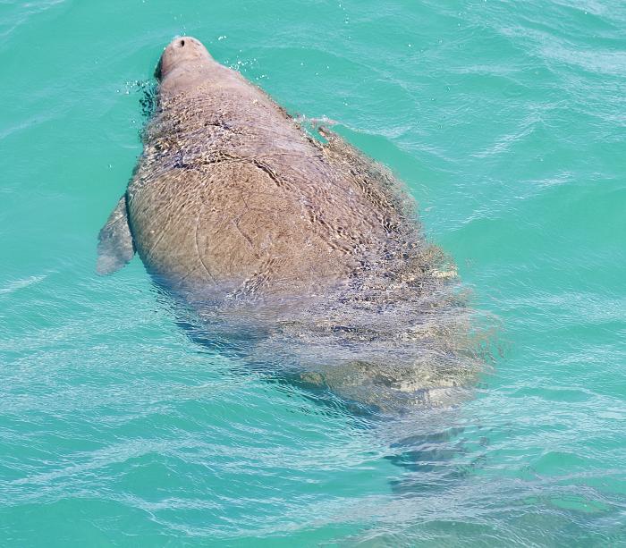 Da sich in der Shark Bay 10 Prozent des Weltbestandes der Seekühe rumtreiben, sind wir frohen Mutes bei der Segeltour mit einem Katamaran, welche zu Gesicht zu bekommen. Und was haben wir für ein Glück, Seekuh und Kalb und auch einzelne Seekühe kommen ziemlich nah ans Boot und wir staunen wieder. 600-800 Kilo und so elegant im Wasser. Die Schwanzflosse sieht aus wie bei einer Meerjungfrau. Wir erfahren auf der Tour viel Wissenswertes über Seegras und wie nützlich und wichtig dieses ist. Die Population von Seekühen und Schildkröten korreliert mit dem Vorhandensein von ausreichend Seegras. 2011 wurde Seegras durch Umwelteinflüsse abgetragen und in diesem Jahr wurden keine Kälbchen gesichtet.