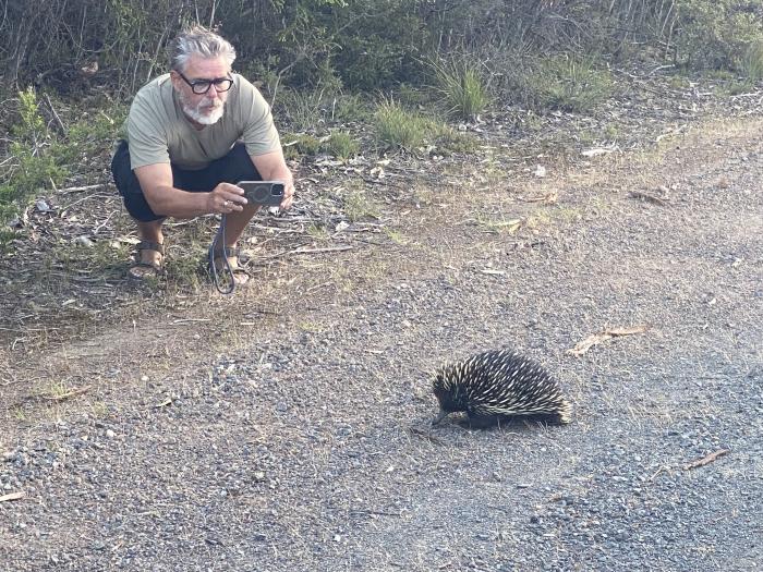 Wir hatten uns einen freien Stellplatz an einem See ausgesucht. Die Dämmerung setzte so langsam ein, als wir auf der Straße vor uns einen Langschnabel Ameisenigel entdeckten. Die stachligen Gesellen heißen und sehen zwar so aus wie Igel, sind aber so genannte Kloakentiere. Wie die Schnabeltiere legen Ameisenigel Eier und säugen dann Ihre Jungen. Was hatten wir für ein Glück dieses seltenen Tier zu sehen. In der Dämmerung hoppeln noch einige Kängurus und Wallabies an und auf der Strasse und wir sind froh unfallfrei bis zum Schlafplatz zu kommen.