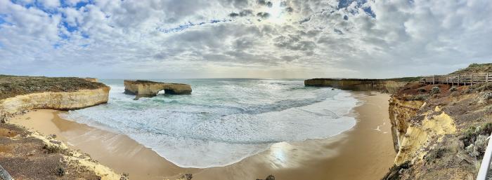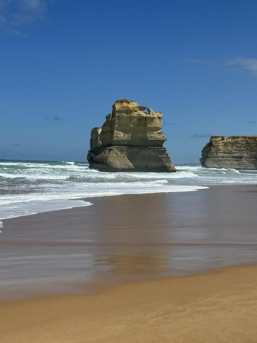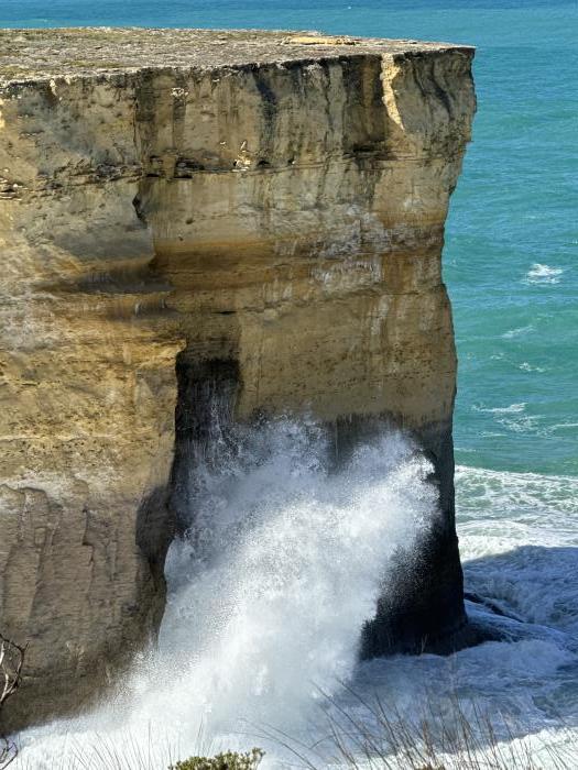 Am nächsten Morgen fahren wir früh direkt zur 200 km entfernten Küste zurück. Erster Stop: Warrnambool, -eine kleine Stadt mit etwa 35.000 Einwohnern. Hier bummeln wir entlang von Skulpturen und Streetart, bewundern am Beach Segler, Surfer und die Arbeit der Küstenwache und tauchen anschliessend in die dort entspringenden heißen Quellen ein. Wir aalen uns ca 2 Stunden in den bis zu 40 Grad heißen Becken, bevor wir zur 243 km langen Great Ocean Road aufbrechen.