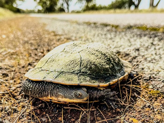 Über eine sehr kleine, aber landschaftlich sehr schöne Straße fahren wir zum NP. Eine Notbremsung wurde für eine Australische Schlangenhalsschildkröte ausgeführt. Diese habe ich dann sicher über die Strasse getragen (zum Dank -oder auch aus Angst :-) hat sie mich fast angepinselt. Wir sehen viele Emus und einen ganzen Schwarm Rabenkakadus und beeindruckende Bäume.
