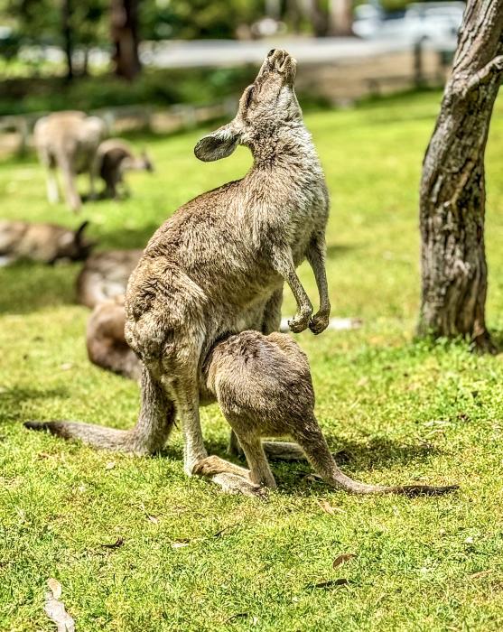 Aktuell leben um die 300 Koalabären dort, wovon viele entlang des Koala Trails zu sehen sind. Wir sehen etliche Koalas, manchmal weit oben im Baumwipfel und manchmal so nah, dass man Sie beim schlafen berühren könnte. Auch eine Mutter mit ihrem Junges haben wir beim schlafen beobachtet, in der Hoffnung, dass Sie noch aktiv werden. Aber nix da, die Süßen schlafen den meisten Teil des Tages. Trotzdem hatten wir mit einem sehr aktiven Tier großes Glück. Ein Armeisenigel ließ sich nicht von uns stören und pflügte mit seiner Schnauze den Boden, auf der suche nach Armeisen, kräftig um. Wir waren sehr happy den Armeisenigeln so gut beobachten zu können.