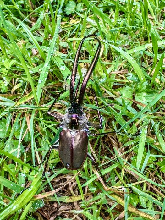 Wenn man hier tief in die Wälder eintaucht, erlebt man schnell und intensiv einen gemässigten Regenwald, der bis auf die Farbe nicht viel mit unseren Wäldern zu tun hat. Wir haben in den botanischen Gärten der Welt ja schon einige Epiphyten gesehen (Pflanzen die auf Pflanzen sitzen), aber was hier auf den grossen Bäumen abgeht, ist echt unglaublich. Hier ist jeder der bis zu 50 m hohen Bäume sein eigenes Ökosystem mit einer Vielzahl von verschiedenen Pflanzen vom alles überwuchernden Moos über die endlosen Lianen bis hin zu recht normal aussehendem hohen Gras, dass in 10 m Höhe auf den Ästen wächst. Wir fühlen uns wie in einem Zauberwald aus längst vergangener Zeit. Dazu passend sehen wir am Wegesrand eine Südandenhirschkäfer. Der einsetzende Dauerregen schmälert das Erlebnis keineswegs.