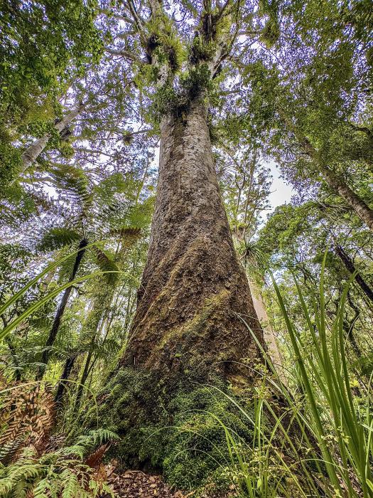 Unsere Route führt uns nun in die Northland Region, welche sich im nördlichsten Teil der Nordinsel Neuseelands befindet. Northland ist im Westen von der Tasmansee und im Norden sowie Osten vom Pazifischen Ozean umgeben. Im Süden grenzt die Region an das Gebiet von Auckland. Wir fahren der Westküste entlang. Ca. 270 km nordwestlich von Auckland befindet sich der Waipoua Forest, einem der letzten verbliebenen, ursprünglichen Wälder Neuseelands mit einem hohen Anteil an Kauri-Bäumen. Dort übernachten wir auf einem DOC Campingplatz, welcher direkt am Waldrand liegt. Das hier die Bäume überhaupt noch stehen liegt wohl daran, dass die Bodenqualität hier viel zu schlecht ist, um daraus Weide- oder Farmland zu machen. Das Gebiet wurde im Jahr 1952 nach heftigen Protesten von Umweltschützern gegen die überall üblichen Rodungen zum Naturschutzgebiet erklärt. Der Kauri Baum ist endemisch in Neuseeland und nirgendwo sonst auf der Welt anzutreffen. Die fichtenartigen Bäume können einen Durchmesser von bis zu 15 Metern und eine Höhe von über 50 Metern erreichen.
