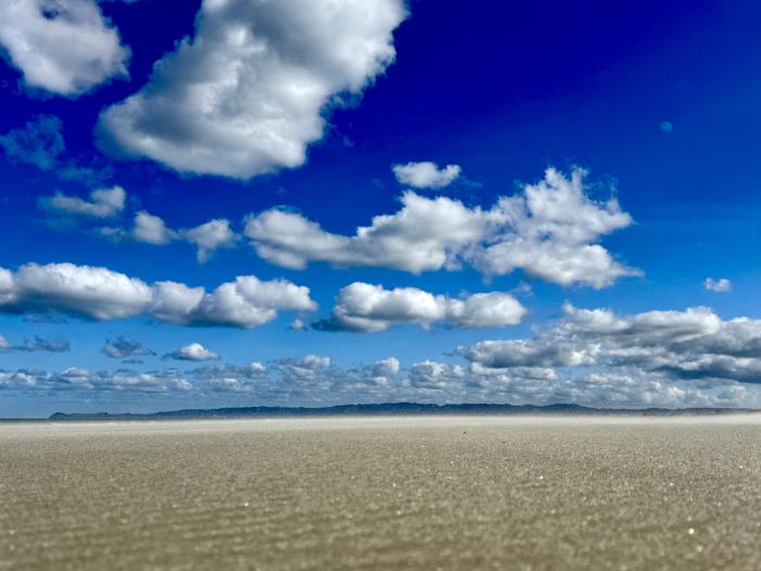 Felsen in grotesken Formen verteilen sich im Sand. Darüber sind in den blauen Himmel malerisch weiße Wolken gekleckst. Wir speichern uns den einzigartigen Anblick im Kopf ab.