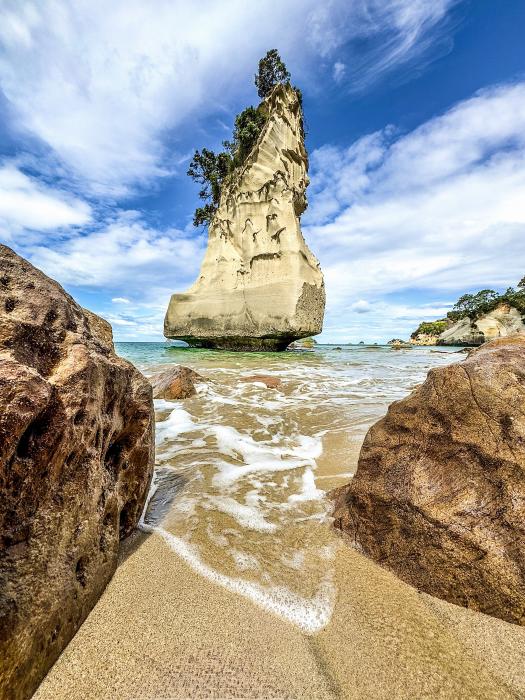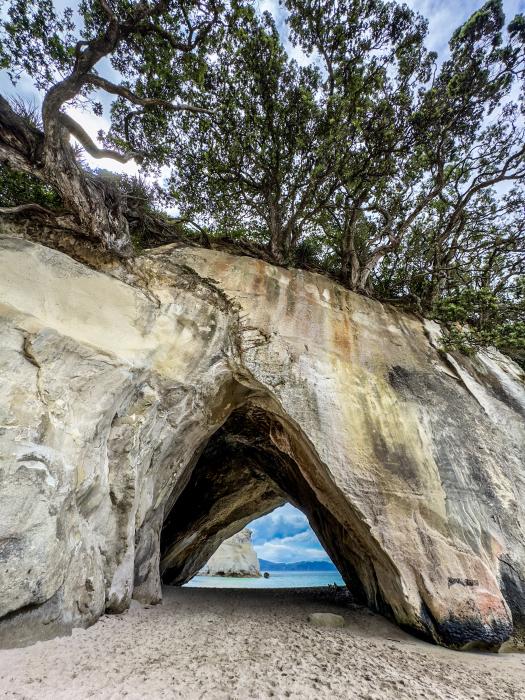 Vom nördlichen Ende des Strandes führt ein Weg oben am Kliff entlang und dann hinunter in die Bucht. Insgesamt brauchen wir etwa eine Stunde dort hin. Unten angelangt erblickt man sofort den riesigen bogenförmigen Höhlendurchgang in einem weißen Felsvorsprung, der zwei abgeschiedene Buchten verbindet. Der an eine Kathedrale erinnernde Bogen lässt den Ort majestätisch und imposant wirken. Der Sandstrand mit Schatten spendenden Pohutukawa-Bäumen entlang des Ufers ist ein idealer Ort zum verweilen. Das findern aber auch viele viele andere Leute, so dass das Fotografieren ohne fremde Personen zum Geduldspiel wird. Aber trotz der Menschenmassen ist dieser Ort magisch, fotogen und besonders. Wir lassen uns das abbaden am 31.12.2024 nicht nehmen - crazy Ende Dezember baden zu gehen, genauso wie Weihnachten bei 28 Grad zu feiern - verrückte Welt für uns. Anschließend fahren wir zurück zum DOC Campingplatz. Am Silvesterabend haben wir uns eine Movie angesehen. Rechtzeitig zum Countdown sind wir aus dem Camper mit einem Glas Sekt gekrochen. Ohne Feuerwerk, ohne eine einzige Rakete am Himmel, ohne ein lautes knallen eines Böllers sind wir glücklich mit den Blick zum unglaublichen Sternenhimmel ins neue Jahr gerutscht. Wir hatten vorab gelesen, dass in Neuseeland um Mitternacht auf Töpfe und Teekessel geschlagen wird – je lauter, desto mehr Glück bringt das neue Jahr mit sich. Diesen Brauch haben wir prompt umgesetzt und hoffen das 2025 für alle Bekannten, Freunde und natürlich unserer Familie ein glückliches und zufriedenes Jahr wird.