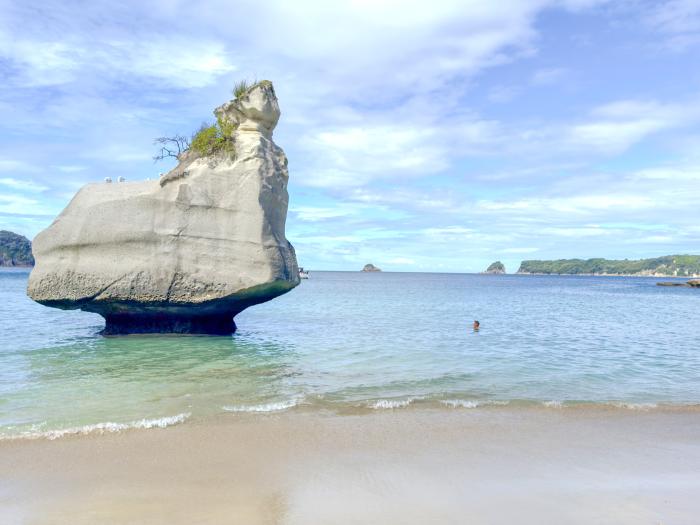 Von dem wunderschönen Strand Hahei gelangen wir zu Fuß nach Cathedral Cove, wo ein natürlich entstandener Felsbogen sofort unsere Kamera zücken lässt.