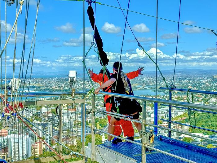 Hinter dem Nervenkitzelerlebnis steckt der gebürtige Neuseeländer A J Hackett, der den Extremsport Bungee-Springen populär gemacht hat. Wer mag, kann einen Spaziergang auf dem 1,2 Meter breiten Gehweg um den Tower machen. Kein Geländer, 192 Meter in der Luft und nichts als Luft auf beiden Seiten. Wem das noch nicht reicht, kann einen Jump vom Tower wagen. In 11 Sekunden fliegt man 53 Stockwerke mit einer Geschwindigkeit von 85 km/h runter - nix für uns. Wir sehen lieber bei einem Glas Wein den Verrückten hinterher.