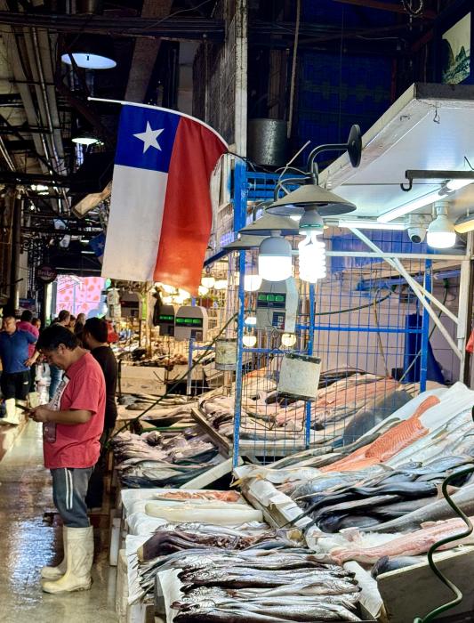 Der Mercado Central befindet sich in einem schönen historische Gebäude. Nur wenige Fischstände sind geöffnet und wir werden von jedem Marktbetreiber angesprochen bei ihm etwas zu kaufen oder zu essen. Da die Restaurants im Markt wenig attraktiv aussehen und wir uns eher bedrängt fühlen, laufen wir relativ schnell durch das Marktgebäude. Früher war der Markt anscheinend sehr lebhaft und typisch chilenisch. Heute scheint er nur noch für Touristen dazusein.