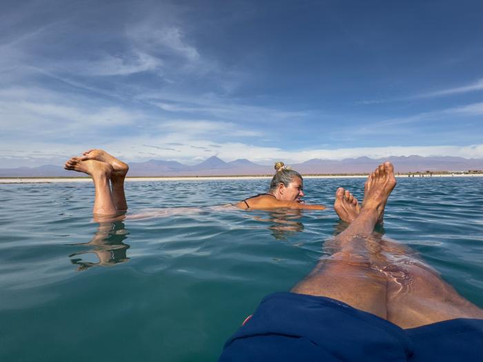 Die Fahrt bis zu den beiden Lagunen dauerte von San Pedro de Atacama nur eine halbe Stunde. Wir folgten einem Holzbohlenweg und genossen von der Aussichtsplattform den Blick auf die beeindruckenden Vulkane der westlichen Kette des Anden Hochgebirges. Die Laguna Cejar besitzt einen Salzgehalt von mehr als 40% und wird daher auch als das Tote Meer von Chile bezeichnet. Allerdings ist das Baden in der Laguna Cejar nicht mehr erlaubt, sondern nur noch in der danebenliegenden Laguna Piedra (die übrigens auch einen Salzgehalt von über 40% besitzt). Ertrinken kann man hier nicht, auch tauchen ist kaum möglich und sollte man auch tunlichst lassen. Wir gehen ins kühle Nass, lasse uns ein wenig treiben und genießen den sensationellen Ausblick.