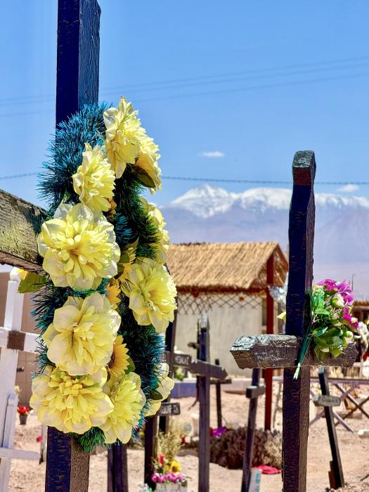 San Pedro de Atacama - wir erleben die WüsteNachdem wir gut in Calama gelandet sind, ging es am „Dorf“ Airport recht schnell. In der Ausgangshalle warteten etliche Taxifahrer und Mitarbeiter von Transportunternehmen. Jeder bot lautstark einen Transfer nach San Pedro an. Zum Glück hatten wir vorab den Shuttle gebucht, so dass wir uns dem Kampf um Fahrgäste entziehen konnten. Auf der gesamten Strecke zwischen Calama und San Pedro (101 km) ist weit und breit kein Leben in Sicht. Hin und wieder begegneten wir einem Auto, Touristenbus oder Truck. Am Strassenrand waren in unregelmässigen Abständen Kreuze aufgestellt worden, wahrscheinlich wegen eines tödlichen Unfalls. Schätzungsweise waren die geraden Straßen, die zu Unkonzentriertheit und die wenigen Fahrzeuge Ursache für die vielen Kreuze.