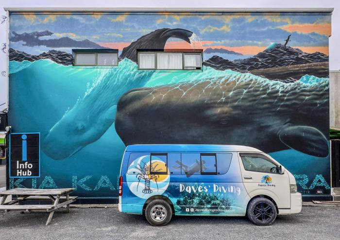 Für den nächsten Tag haben wir eine Delfin - Wale Tour gebucht, da dies u.a. das Highlight hier ist. Die malerische Küstenstadt Kaikōura ist der perfekte Ort, um Meeresbewohner zu beobachten und an der Küste entlang zu spazieren.Die Landschaft in Kaikōura ist spektakulär: Die Stadt liegt zwischen der zerklüfteten Seaward Kaikōura Range und dem Pazifischen Ozean. Auf den Bergspitzen liegt noch ein wenig Schnee und die langen weißen Wolken mit blauem Himmel begrüßen uns am Morgen.