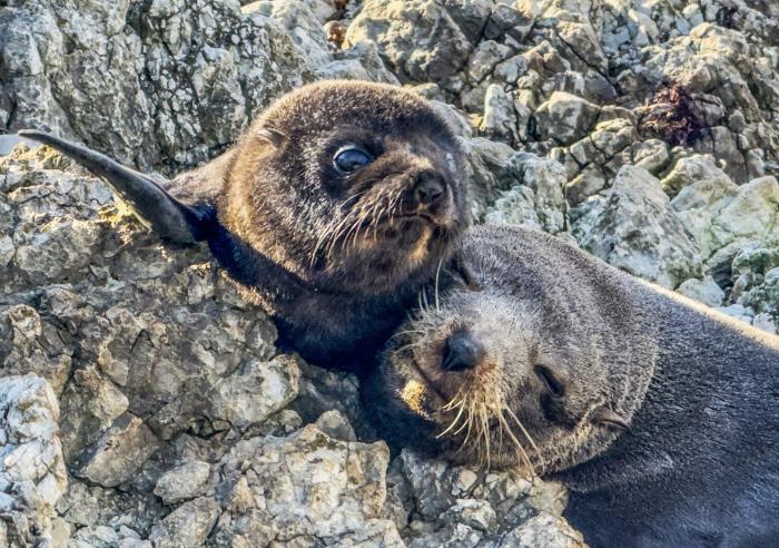 Wir fahren mit ein Katamaran, welcher bis zu 60 Km schnell ist, raus zum Unterwassercanyon. Von weitem sind bereits die springenden Delfine erkennbar. Hierbei handelt es sich um Schwarzdelfine, welche sich in Kaikōura das ganze Jahr aufhalten und in Schulen von mehr als Hundert bis über 1000 Delfinen zusammenleben. Beim Eintreffen kommen etliche Delfine zum Boot und kreuzen vor dem Bug. Dieser Glücksmoment bleibt unvergesslich. Was für eine Freude, den Delphinen beim umherjagen, springen und Salti schlagen zuzusehen.