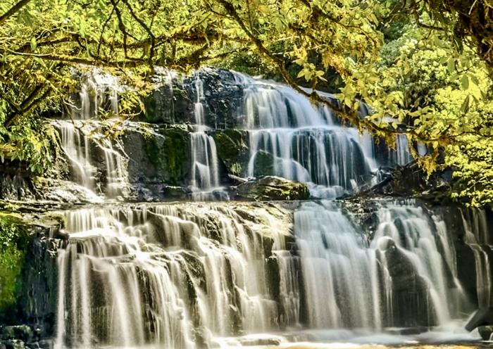 Die Purakaunui Falls sind eine Kaskade mehrerer Wasserfälle des Purakaunui Flusses. Die Fallhöhe beträgt zwar nur 20 m, dennoch dienen sie als ein Wahrzeichen für Südost-Neuseeland und sind auf einer neuseeländischen Briefmarke von 1976 abgebildet. Uns hat der Anblick nicht umgehauen, aber nach dem vielen Fahren, ist eine kurzer Spaziergang eine willkommene Abwechslung für unseren Körper.