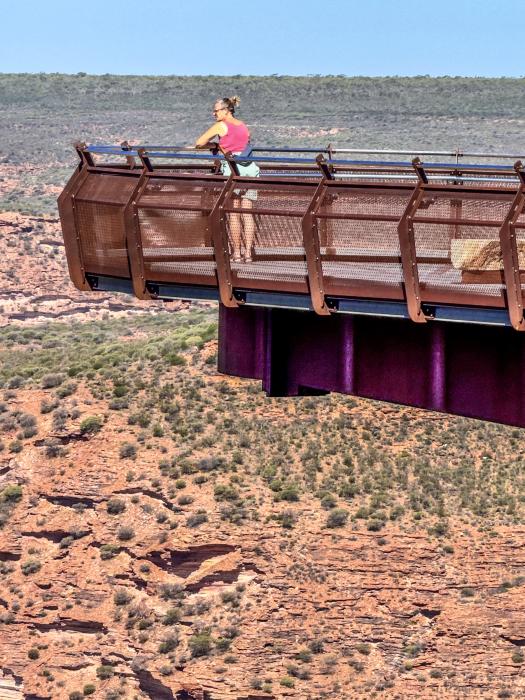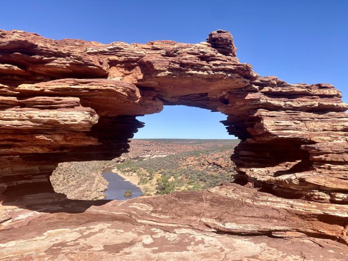 Der Kalbarri Nationalparks an der Küste mit dem Skywalks,- freitragende Aussichtsplattformen, die in 100 Metern Höhe weit in die Schlucht des Murchison River hineinragen und eine spektakuläre Aussicht bieten. Auch das berühmtes „Nature’s Window“ – ein Felsfenster mit beeindruckendem Blick über die Schlucht haben wir besucht.