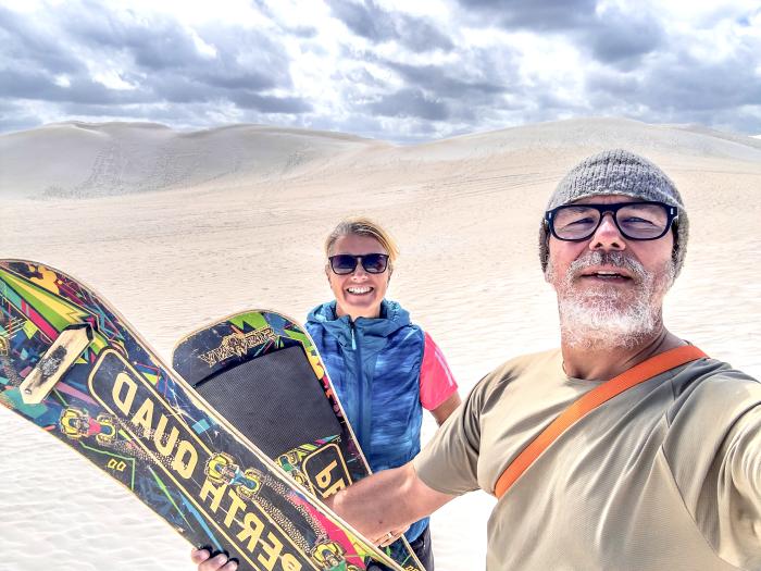 Durch regelmäßiges Wachsen plus der richtigen Technik - kann jeder Langläufer bestätigen :-) - erhöhen wir unsere Abfahrtsgeschwindigkeit und werden immer waghalsiger. Nach einer Stunde hoch und runter auf die Düne merkt man schnell, was man getan hat. Der feine Sand versteckt sich nach Verlassen der Dünen an jeder Körperstelle, so dass wir noch lange an den Spass erinnert werden.