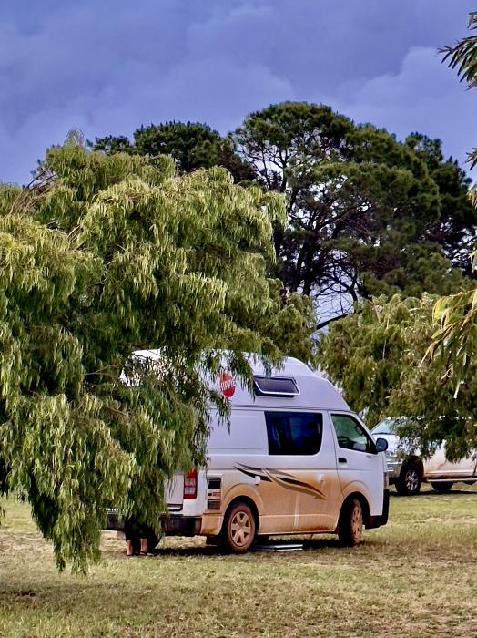 Unser Nachtlager wollen wir im Nationalpark aufschlagen, dort gibt es einen kleinen Platz mitten im Outback. Der Weg dorthin besteht aus löchriger und nasser gravelroad und wir sind schon ein bissel unsicher, ob unser kleiner Camper das durchhält. Durchgeschüttelt und mit rotem Sand bespritz kommen wir auf dem farmähnlichen Gelände an. An den Türen zu den Waschräumen befinden sich Hinweise, doch unbedingt die Türen immer zu schließen, damit Frösche, Schlangen, Echsen und Hasen „draußen bleiben“. Das beherzigen wir gerne und verschwinden dann auch bald im Camper.