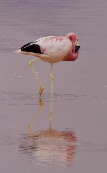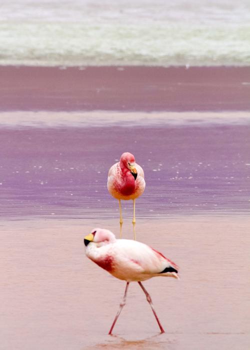 Der See ist für seine großen Bestände von Flamingos der drei Arten Chileflamingo, Andenflamingo und Jamesflamingo bekannt. Hunderte Flamingos stolzieren durch das seichte Wasser und spiegeln sich auf der glatten Wasseroberfläche. Als Sahnehäubchen spazierten noch Lamas, Alpakas und Vikonyas am Uferrand entlang.