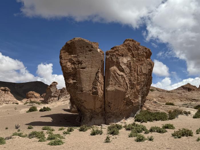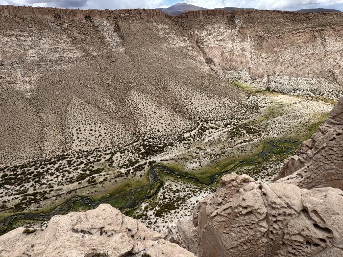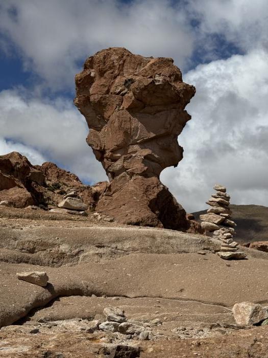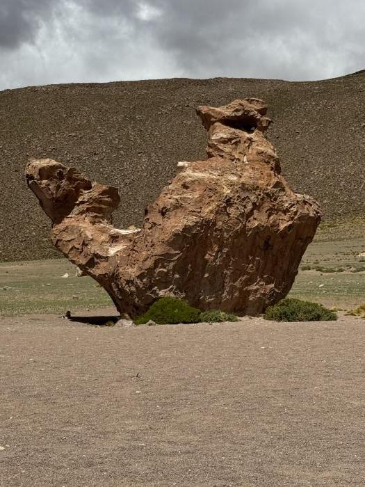 Die Steinformationen sind aus vulkanischem Tuff und stammen von einstigen Vulkanausbrüchen. Durch Wind und Erosion wurden die Felsen zu interessanten Gebilden geformt. Der Fantasie beim Figurenraten ist hier keine Grenze gesetzt. Mal sehen wir ein Kamel, eine gebrochenes Herz oder die Siegestrophäe der Fußball-Weltmeisterschaften. Unsere Wahrnehmung kann aber auch aufgrund der dünnen Höhenluft getrübt sein. Selten haben wir solch kuriose Felsen gesehen. Kaum zu glauben, dass wir uns auf der weiten Ebene ständig über 4.000 Metern bewegen. Am Rand erheben sich die Vulkane zur Grenze nach Chile in noch größere Höhen.Allmählich kommen wir in tiefere Gegenden - unter 4000 Meter. Grün kehrt in die Landschaft zurück.